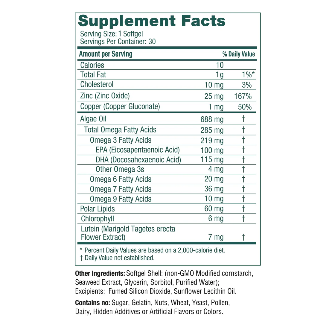 *Plant sources such as flax, hemp, chia, and ahiflower contain a short-chain precursor to true Omega-3 called ALA. They do not provide true DHA and EPA like algae does.